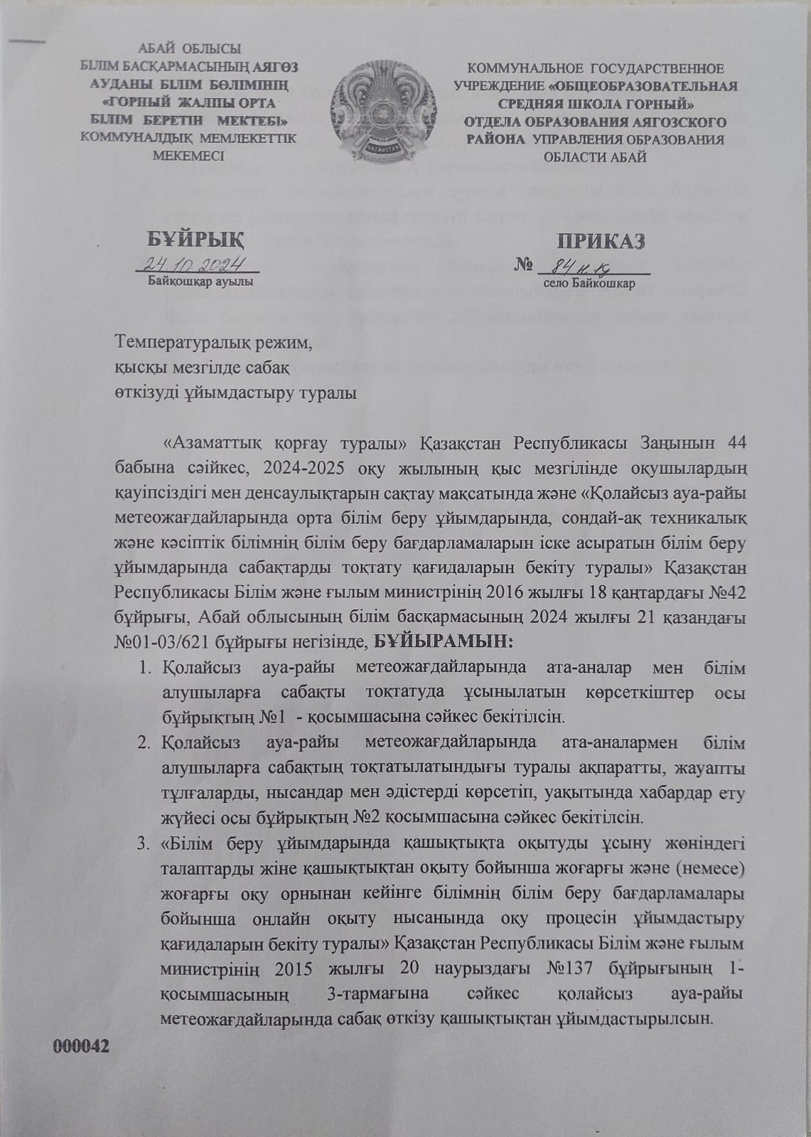 "Горный ЖОББМ" КММ Температуралық режим, қысқы мезгілде сабақ өткізуді ұйымдастыру туралы