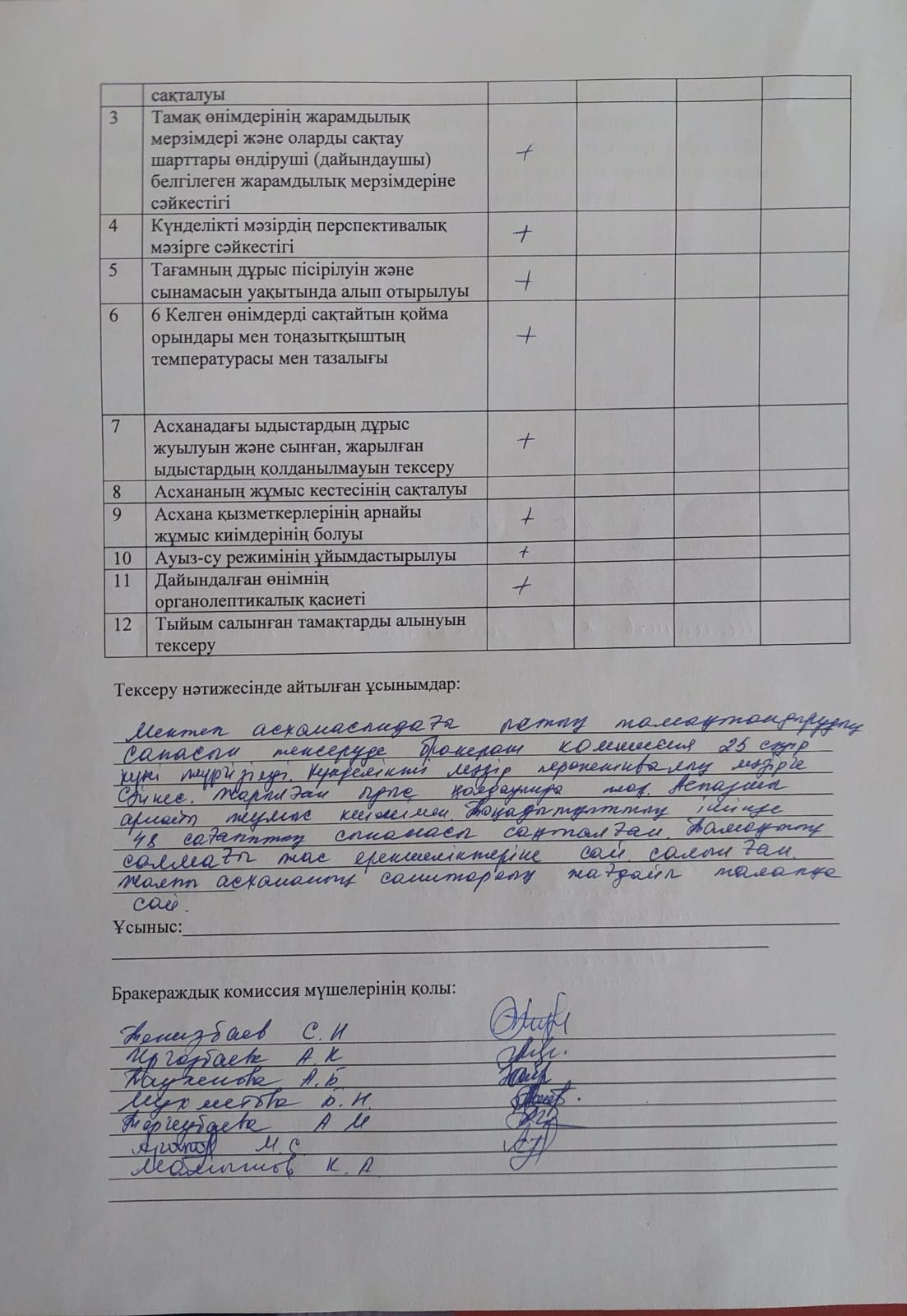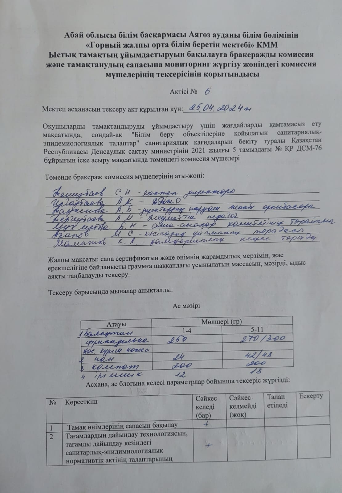 » Ыстық тамақтың ұйымдастыруының бракеражды комиссия тексерісінің сәуір айының қорытындысы