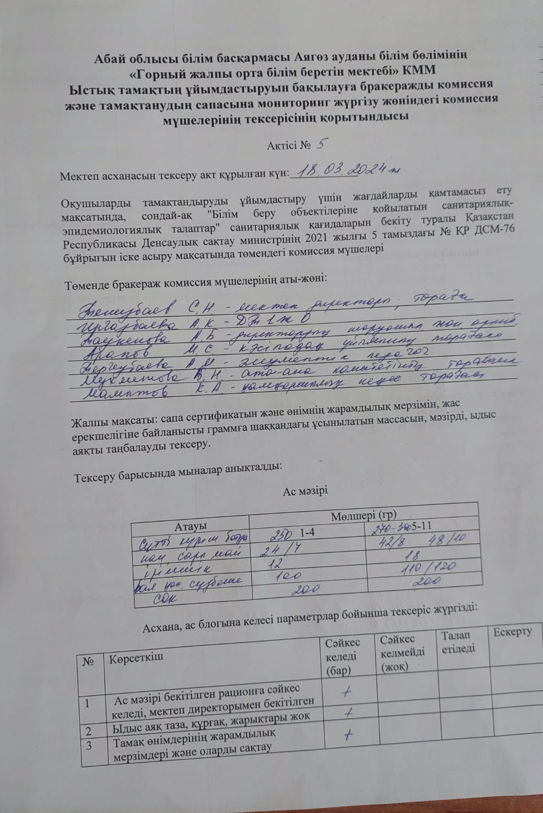 Ыстық тамақтың ұйымдастыруының бракеражды комиссия тексерісінің наурыз айының қорытындысы