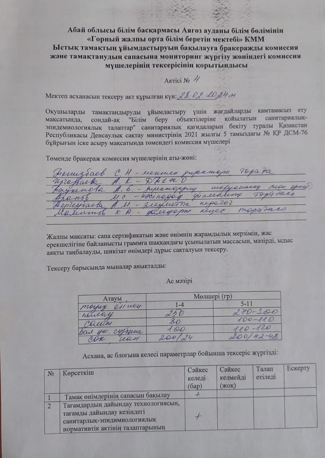 Ыстық тамақтың ұйымдастыруының бракеражды комиссия тексерісінің ақпан айының қорытындысы
