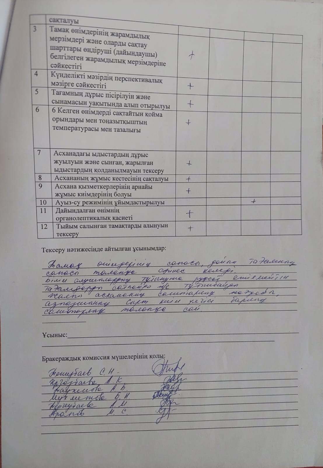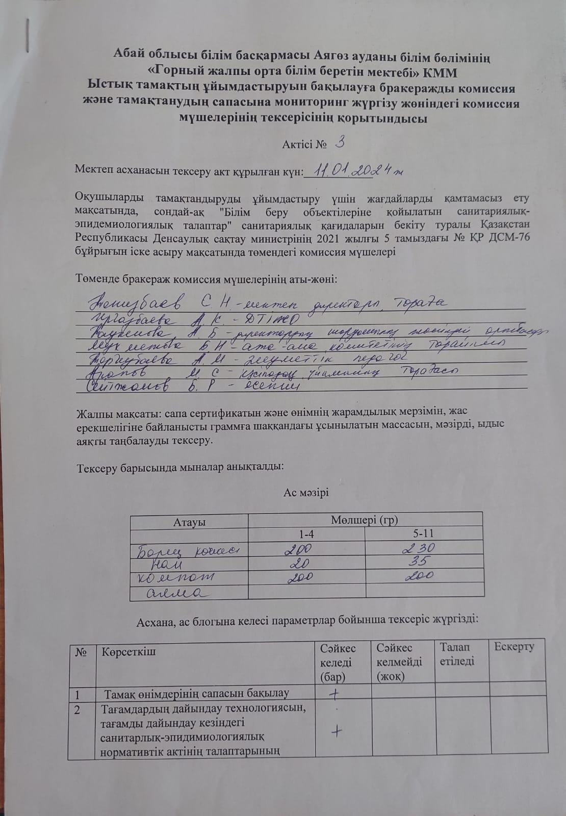 Ыстық тамақтың ұйымдастыруының бракеражды комиссия тексерісінің қаңтар айының қорытындысы